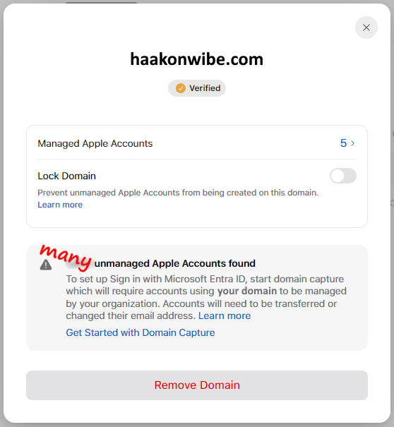 - Option to lock your domain to prevent people from creating personal Apple Accounts on your domain.