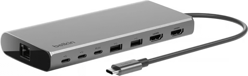 For my daily setup, I use the Book 5 Pro with a Belkin 8-in-1 USB-C hub. This hub gives me everything I need to turn the laptop into a full workstation: dual HDMI, multiple USB-A and USB-C ports, and Ethernet. I plug it in once, and everything is ready.