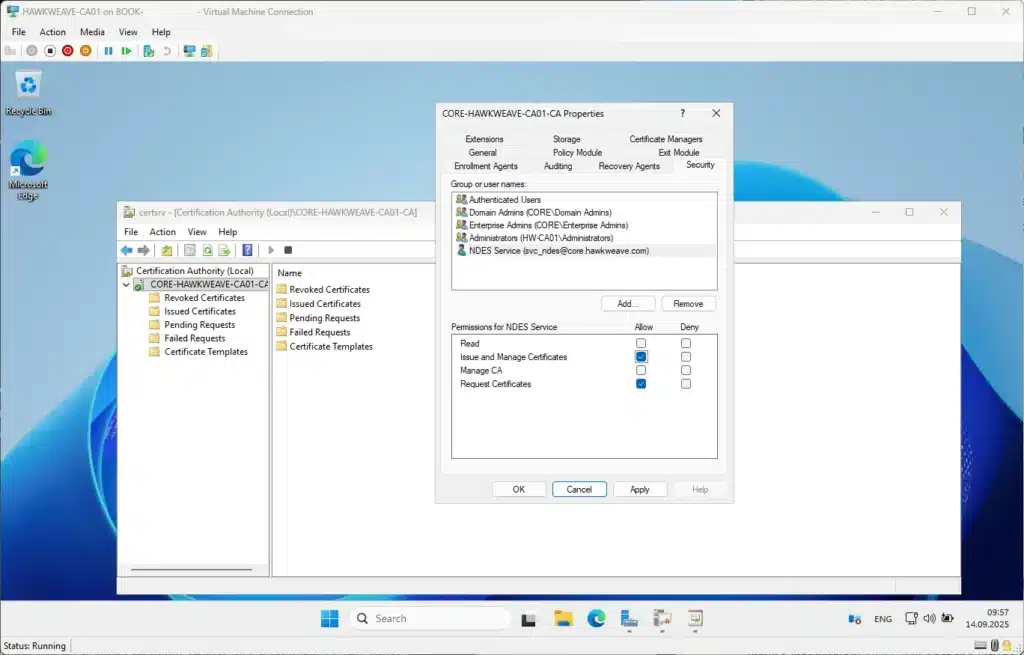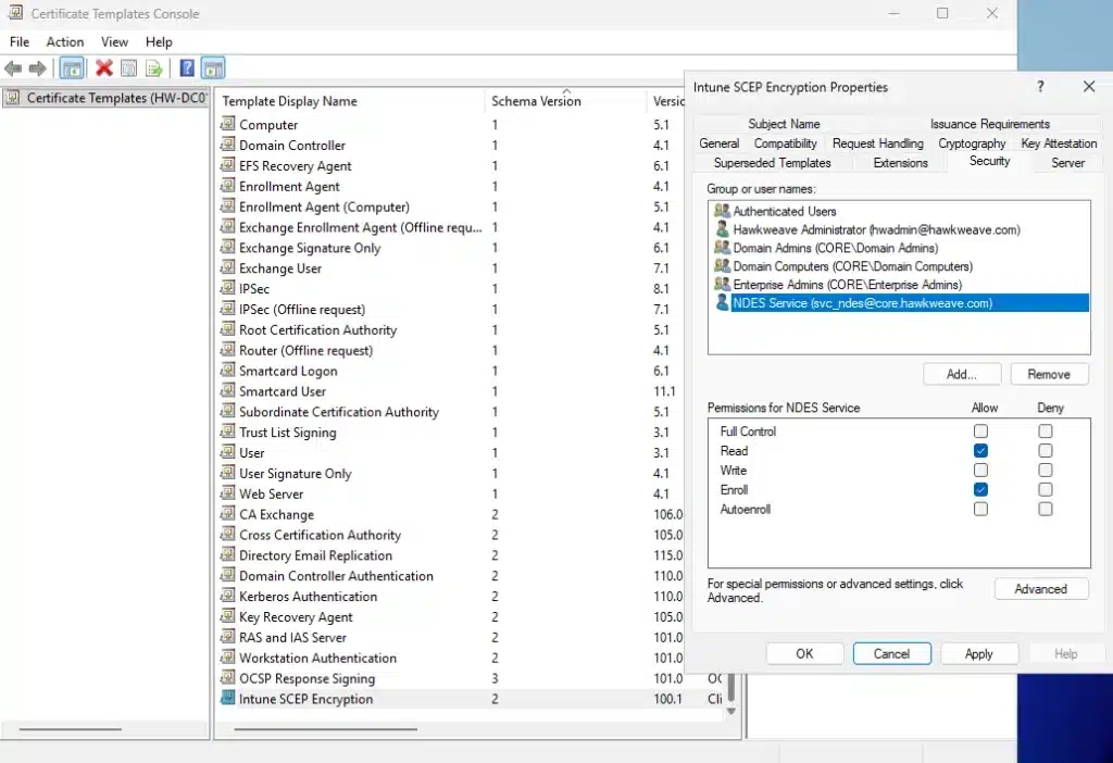- Add “CORE\svc_ndes” with Read permissions