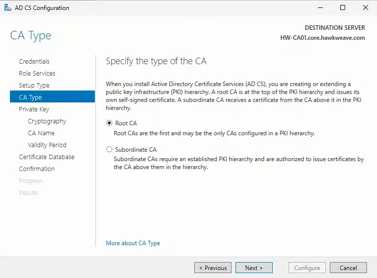 - CA Type: Root CA (since this is our first CA in the forest)