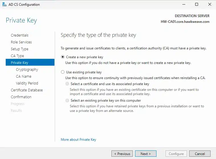 - CA Name: CORE-HAWKWEAVE-CA01-CA (I changed this from the default to be more descriptive)