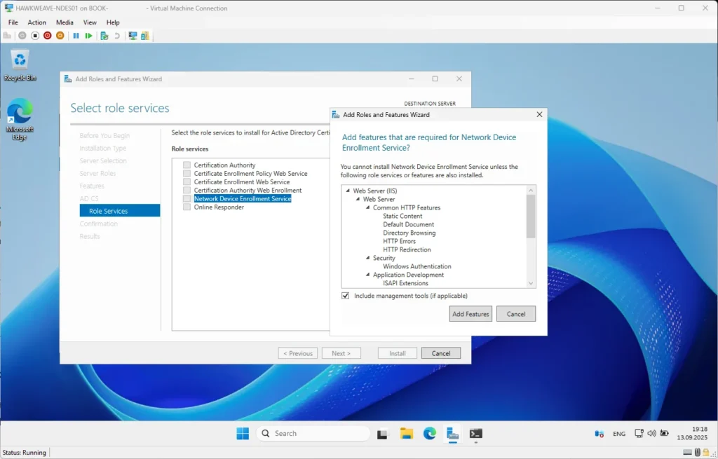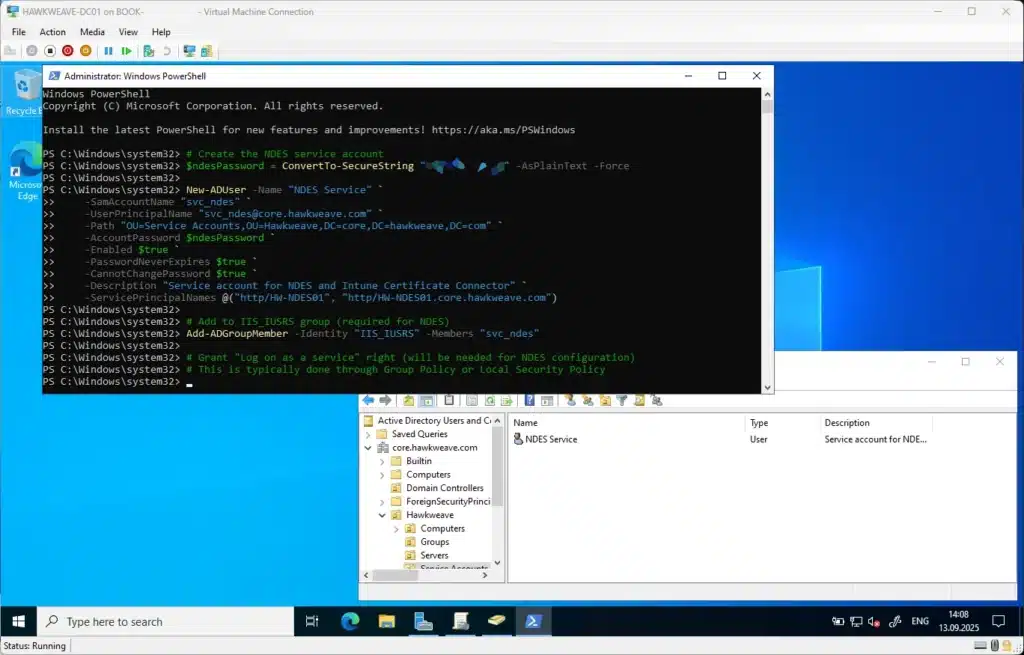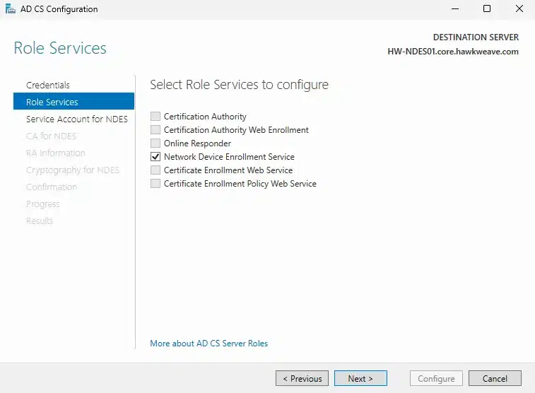 - NDES Server (HW-NDES01): Domain-joined, same forest as CA, NOT a domain controller, NOT the CA server