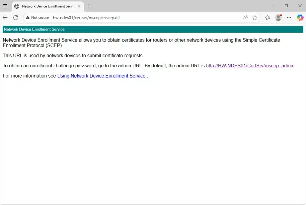 For now, we’ll keep NDES completely internal. In Part 3, we’ll install the Application Proxy on the NDES server to securely publish NDES for Intune access.