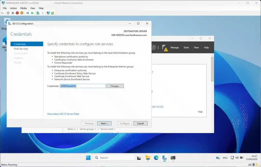 After the domain join reboot, it’s time to install the CA role. I’m setting up an Enterprise Root CA for lab simplicity (you’d normally have an offline root in production).