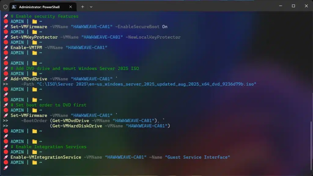 Set-VMFirmware -VMName "HAWKWEAVE-CA01" -EnableSecureBoot On
