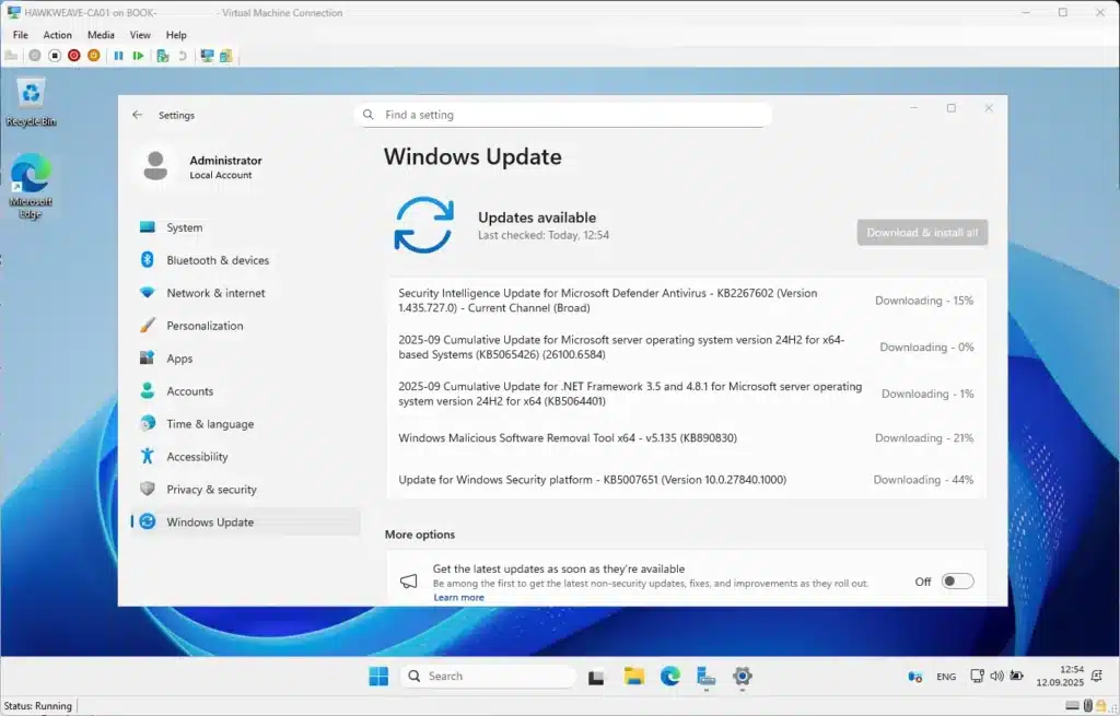 - Disk space requirements: Server 2025 requires significantly more disk space than Server 2022. After initial installation and the first round of cumulative updates, expect it to use 20+ GB. With additional roles like NDES installed, it can approach 30 GB. Consider running Disk Cleanup to remove Windows Update files if space becomes tight, or allocate at least 30-35 GB for VHDs to be safe.