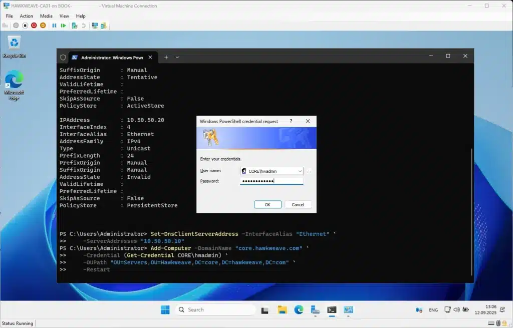 Add-Computer -DomainName "core.hawkweave.com" `
