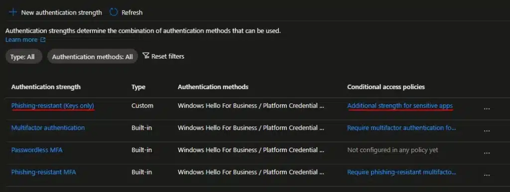 For high-security scenarios, you’d combine both: a profile that restricts admins to device-bound passkeys, plus a Conditional Access policy requiring phishing-resistant auth strength for the Azure portal or Entra admin center.
