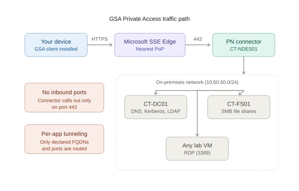 You define which on-prem resources you want to reach (by FQDN, IP, and port), and GSA tunnels only that traffic through Microsoft’s edge network to a connector running on-prem. No split tunneling debates, no “tunnel everything” vs “tunnel nothing” arguments. You declare the apps, GSA handles the plumbing.