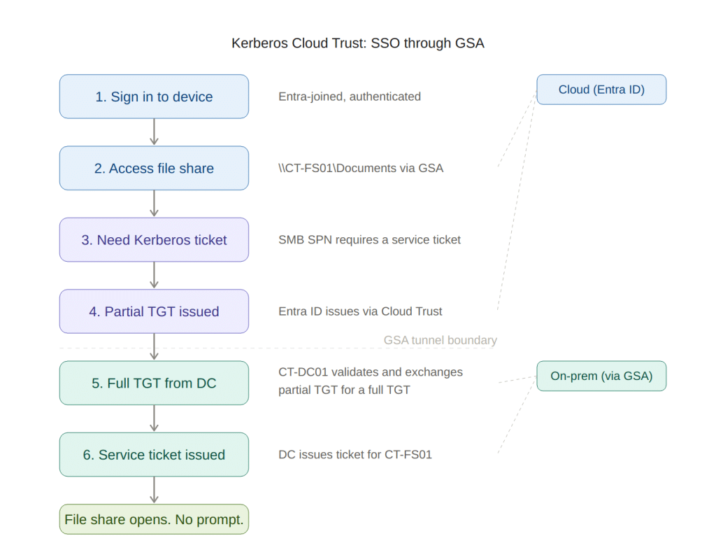 Without Kerberos Cloud Trust, every file share access and RDP connection through GSA would prompt for credentials. You’ve already authenticated to Entra ID, but the on-prem resource doesn’t know that. Kerberos Cloud Trust bridges this gap.