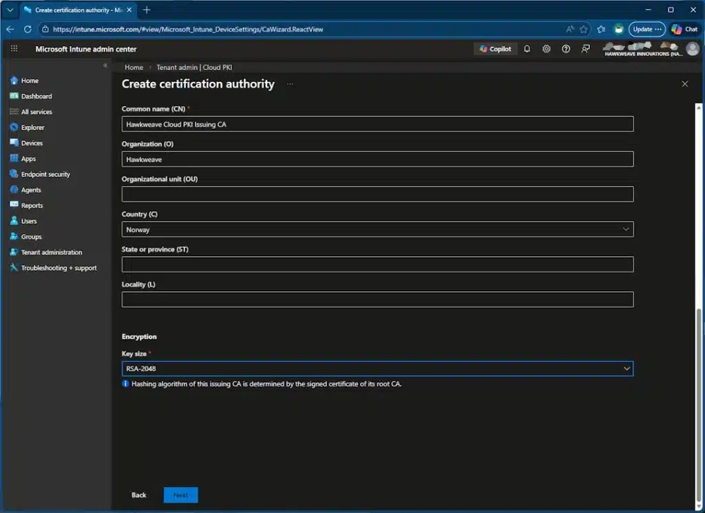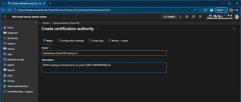 For the basics, give it a name you’ll recognize. I used “Hawkweave Cloud PKI Issuing CA.”