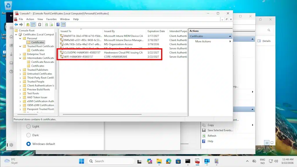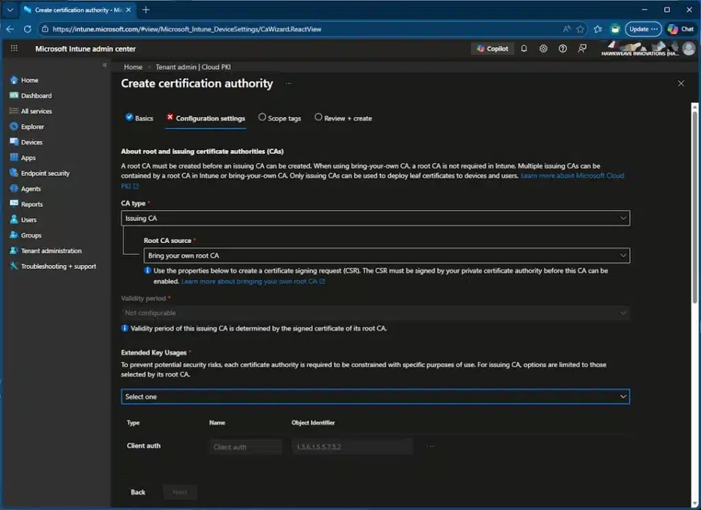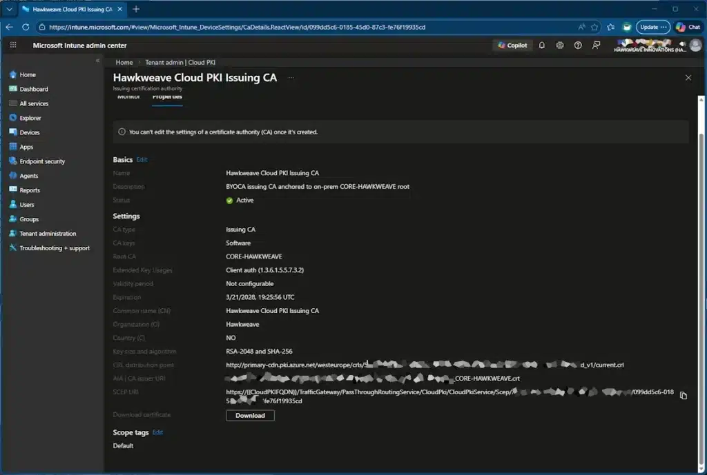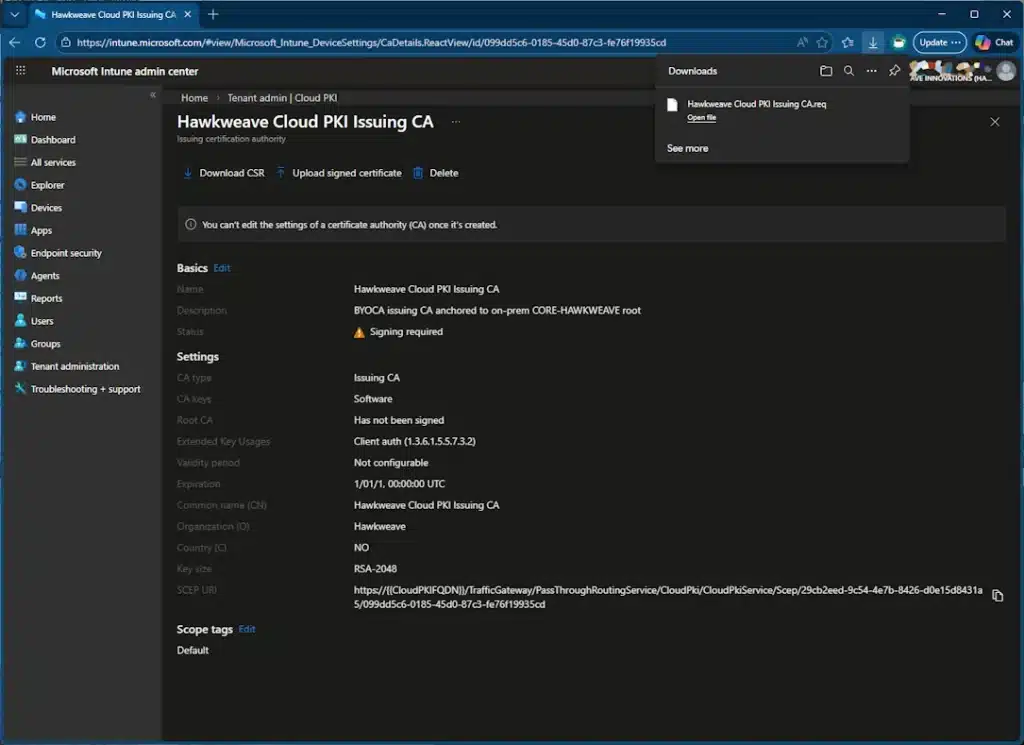 └── Hawkweave Cloud PKI Issuing CA (cloud-hosted in Intune)