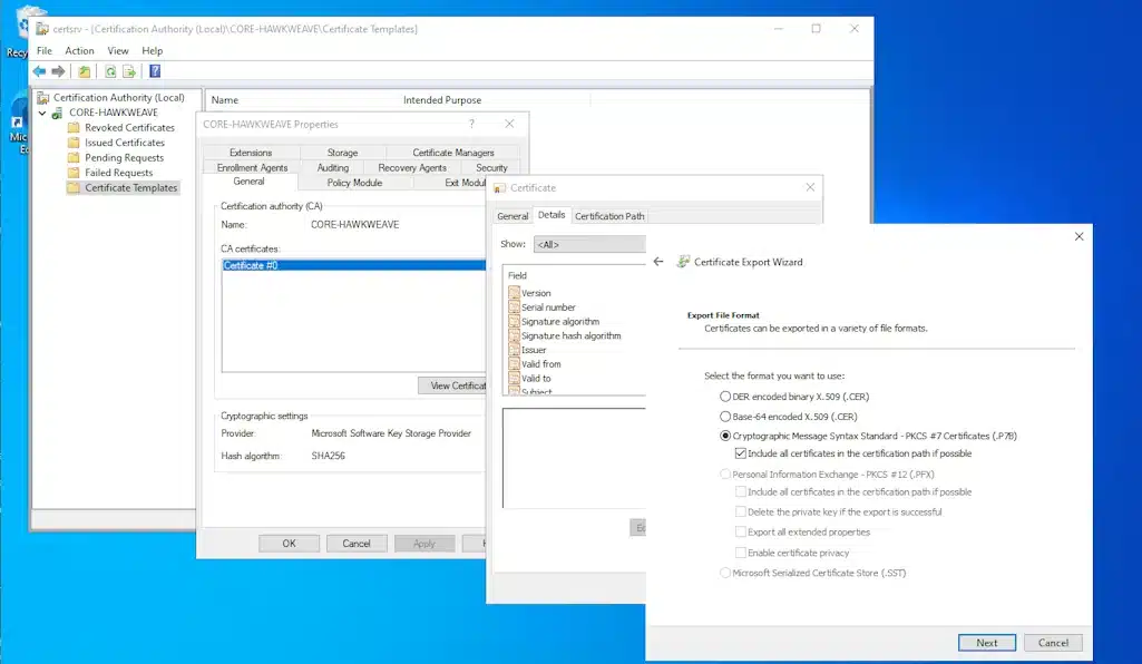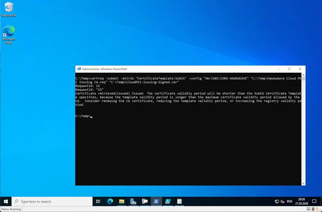 You’ll also see a warning about the validity period being shorter than the template specifies. That’s cosmetic. The issuing CA cert gets truncated so it doesn’t outlive its parent root CA.