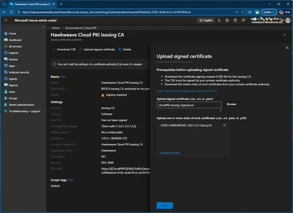 Back in the Intune admin center, select your issuing CA, go to Properties, and click Upload signed certificate.