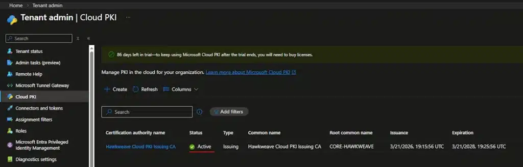 Trial CAs use software-backed keys. If you later buy a Cloud PKI license, the trial CAs keep working but the keys stay software-backed. You can’t upgrade them to HSM. If HSM matters to your compliance requirements, you’ll need to create new CAs post-purchase and redeploy everything.