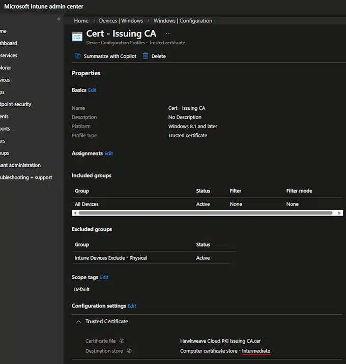 Profile ordering matters. If the SCEP profile tries to enroll before the trusted certificate profiles have deployed, it fails because the device doesn’t trust the chain yet. In practice, Intune usually handles this correctly if all profiles are assigned to the same group at the same time, but it’s worth knowing.