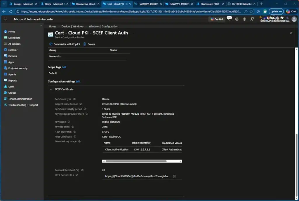 Gotcha #3: Don’t mix NDES SCEP URLs with Cloud PKI SCEP URLs in the same profile. If you have an existing NDES-based SCEP profile, create a separate one for Cloud PKI.