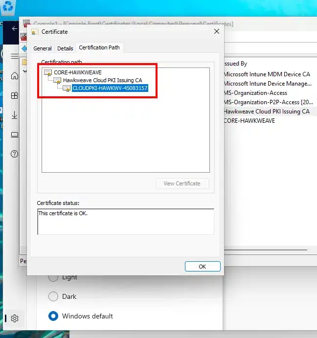 Double-click the leaf cert and go to the Certification Path tab. You should see a clean three-tier chain: root at the top, cloud issuing CA in the middle, leaf cert at the bottom.