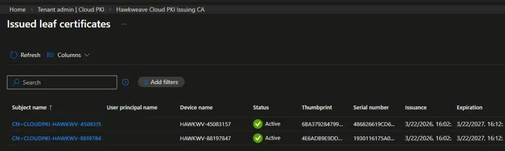 In the Intune admin center, check Devices > Monitor > Certificates for confirmation, and Tenant administration > Cloud PKI > [your CA] > View all certificates to see the issued cert.