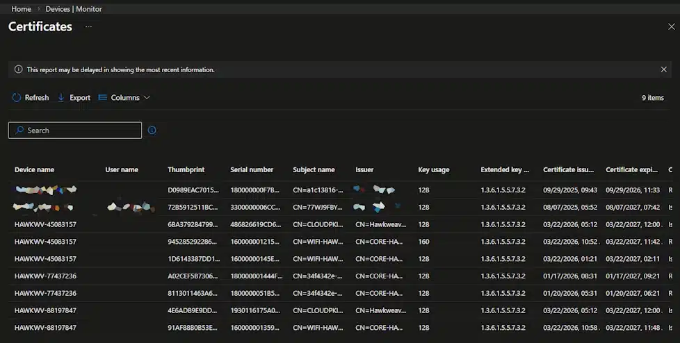 You can also get an overview of all the issued certificates (not just through Cloud PKI) from using the Monitor tab under Devices: